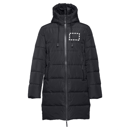 Long padded parka (unisex) in 100% polyester (exterior: 75 g/m² 300T polyester pongee coating, interior: 100% polyester 50 g/m², filling: 335g/m²). With lined and padded hood and elastic cuffs. Warm and sturdy parka with decorative topstitching, with interior and front pockets with waterproof zippers. Sizes: S, M, L, XL, XXL